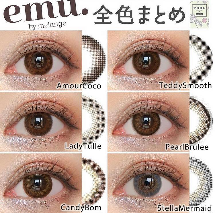 emu. by melange 日本美瞳, 顏色包括Amour Coco, Teddy Smooth, Lady Tulle, Pearl Brulee, Candy Bom, Stella Mermaid
