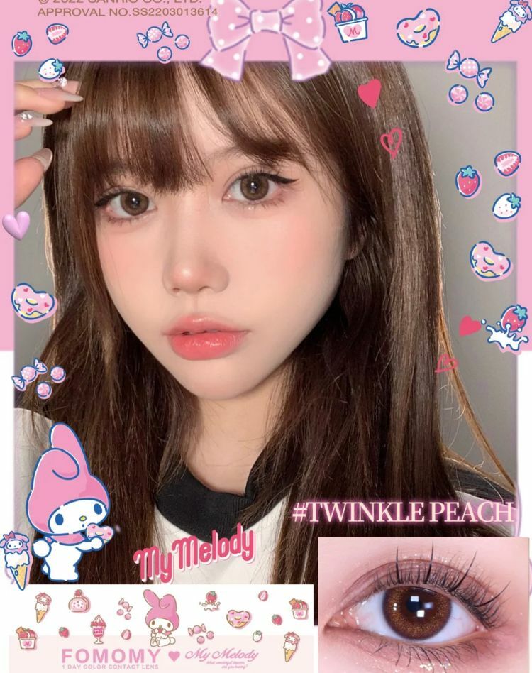 Melody的金箔細閃奶茶奶棕色,金色細閃上眼有玻璃珠的感覺,棕色帶粉調的底色,有Melody的可愛,太陽底下是巨閃的粉棕色,晶瑩剔透!但配合日常妝容上學上班配戴又不會太誇張,值得入手!