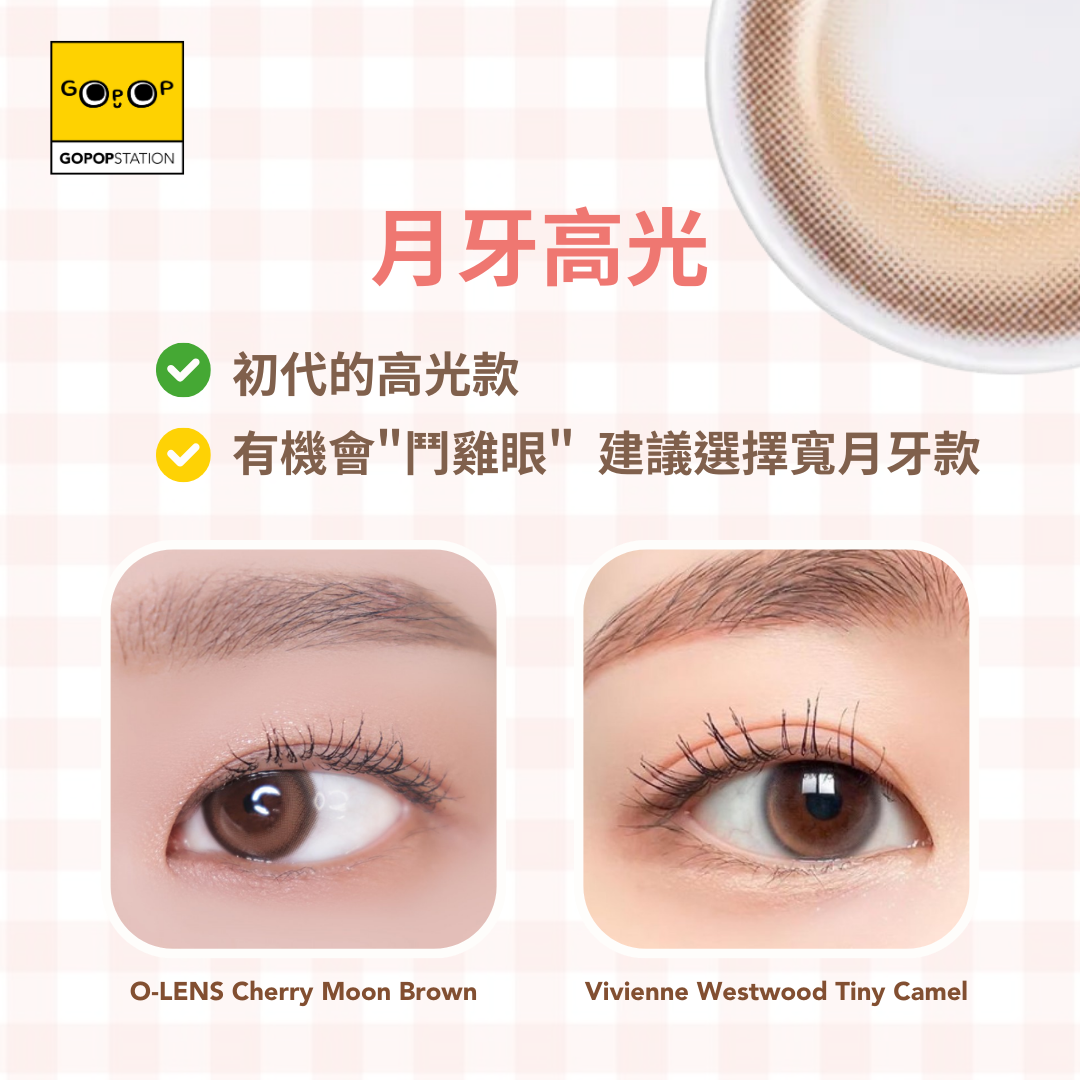 但很多時候, 選擇這些高光款的隱形眼鏡時, 都會怕出現"鬥雞眼"的轉對眼情況, 令拍照時會覺得很怪異, 因為選擇這些高光/月牙類的COLOR CON時都有事項要注意