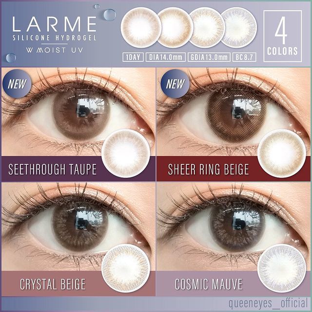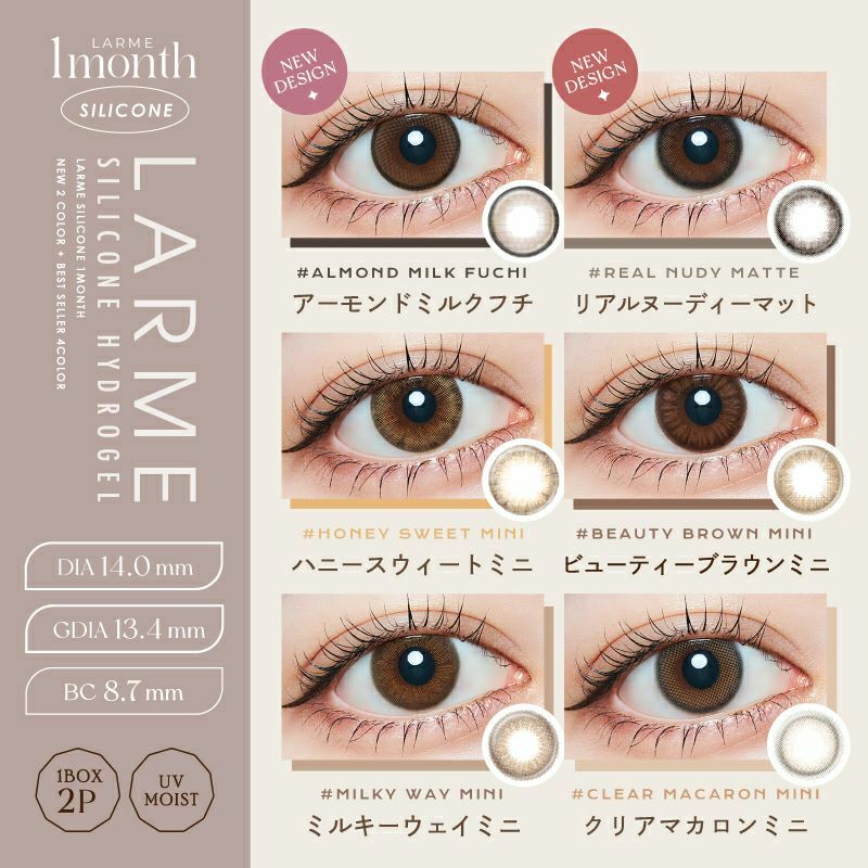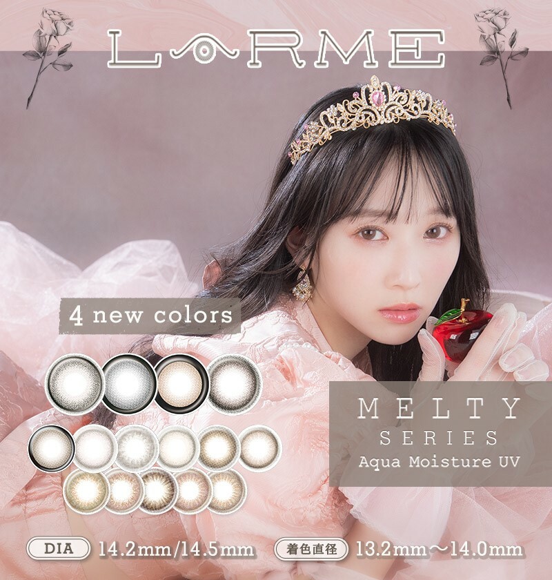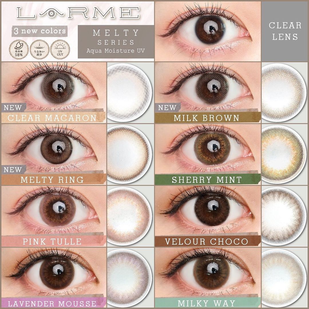 日本品牌隱形眼鏡LARME, 分了幾個系列, 包括全新Larme Silicone Hydrogel, Larme Melty Series, Larme Ring 1 Day, Moisture UV 1 Day, MEiME! 1 Day. 除了顏色唯美自然, 舒適度也很重要, LARME含水量達58%, 定能滿足您需要