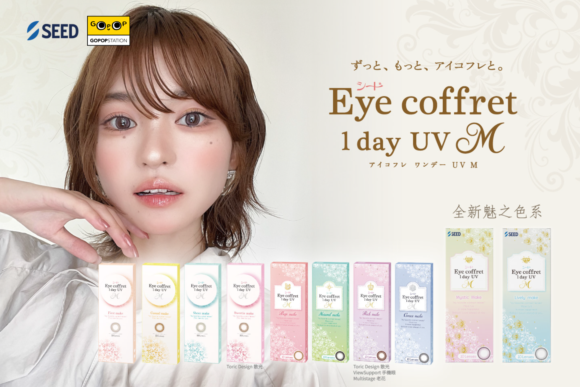 10款 「大亮瞳」Base Make, Natural Make, Grace Make,Rich Make 和First Make。以及其後再推出的Sheer Make, Casual Make。 Sweetie Make 在產品及包裝設計上均 加入大量時尚潮流的元素,更以柔和粉色首飾箱作包裝設計,令人眼前一亮。2025最新顏色: Mystic Make及Lively Make。其中Sweetie Make及Rich Make設有散光版本,Rich Make更設有初老花及老花版本。
